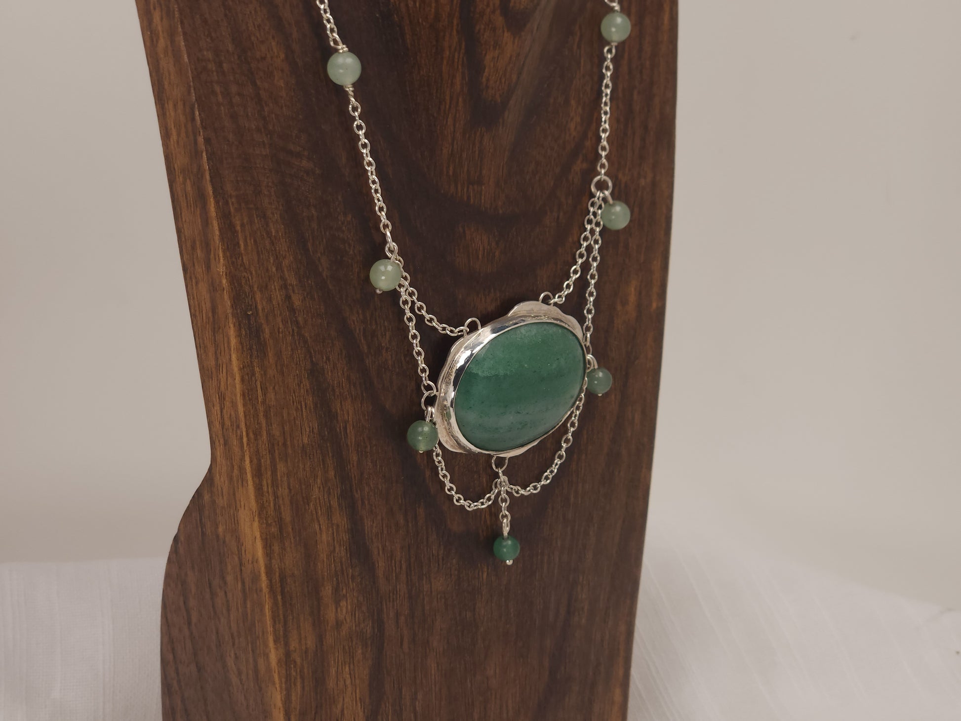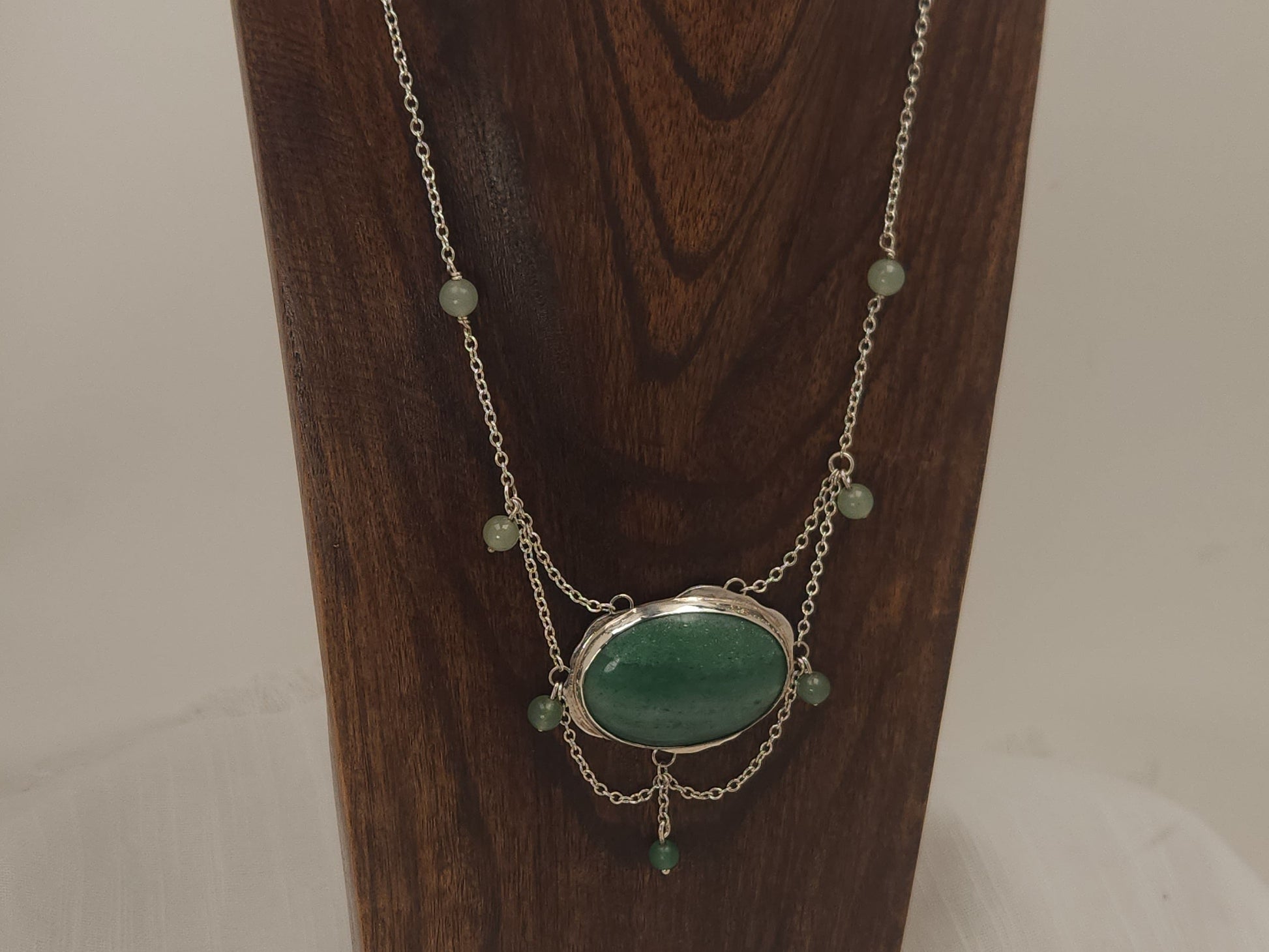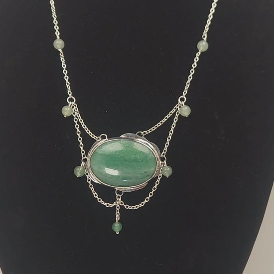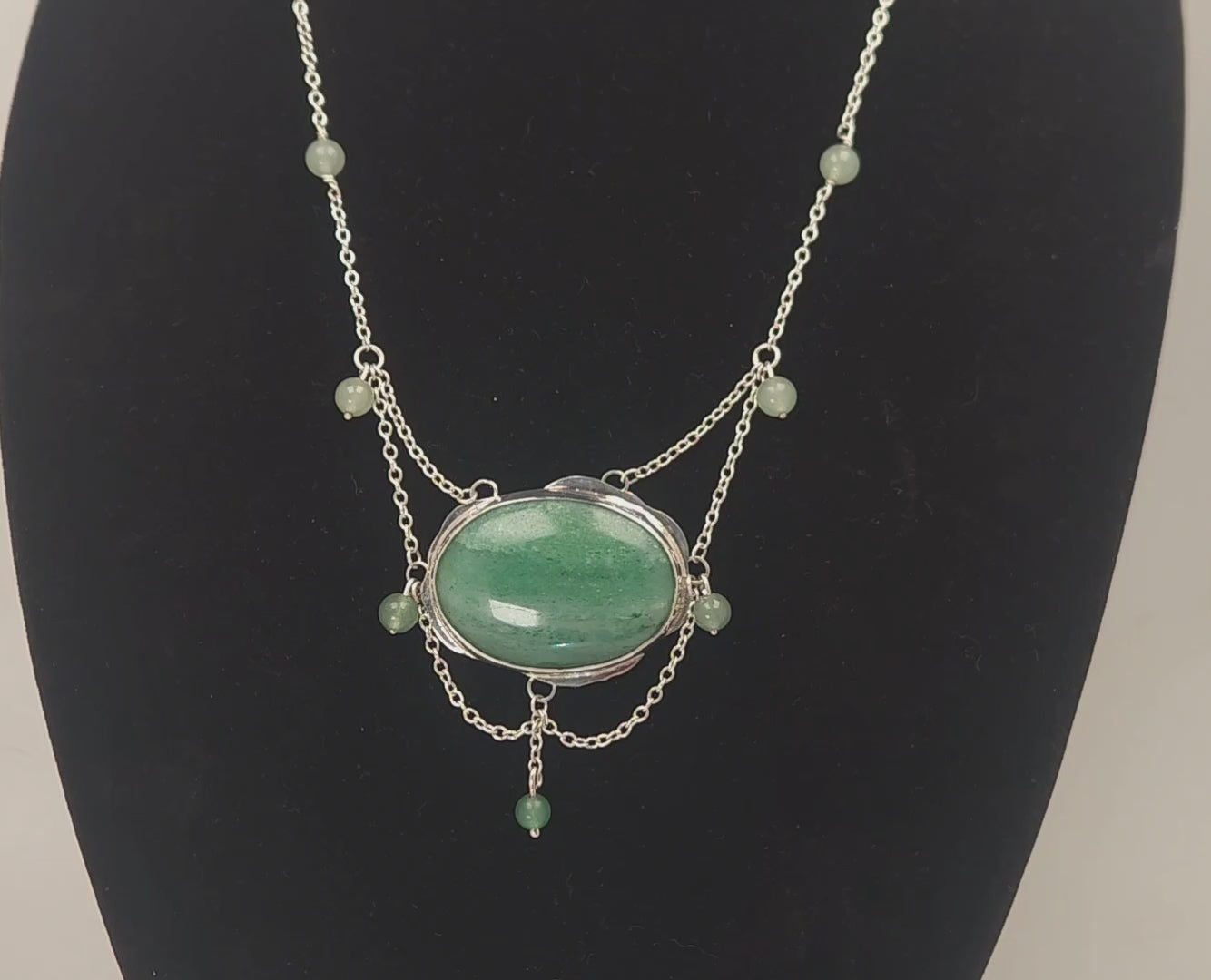 This enormous Aventurine Quartz with unique striations and a subtle glittering sparkle is nestled in a hand-fabricated fine silver and sterling silver mounting. The sterling silver link chain features seven aventurine beads graduating from a bold green to a pale green white. It is clasped with a sterling silver spring ring and the chain measures 19" in length.