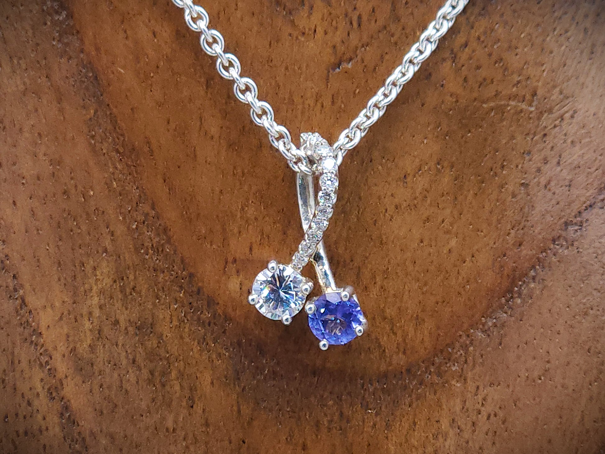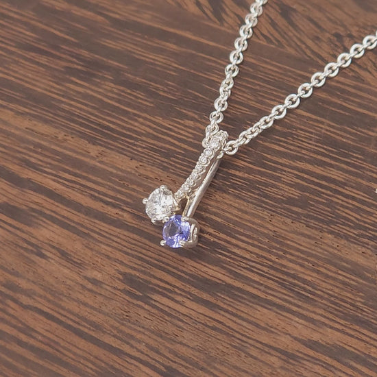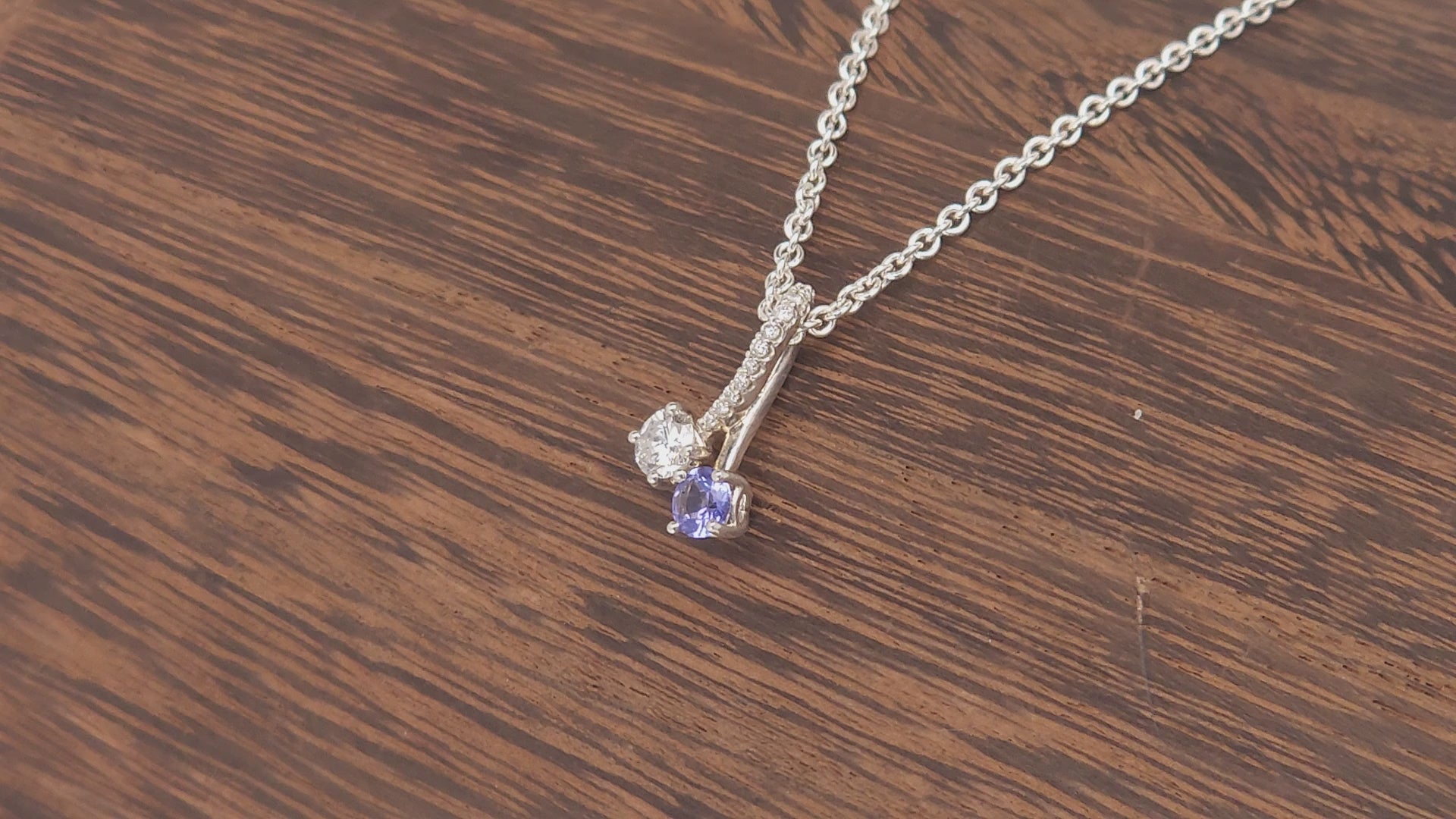 This elegant two-stone pendant features an eye-clean 0.24ct diamond and a pale purple tanzanite, paired together in a sterling silver ribbon style pendant, with melee diamonds set in the bail. The diamond is a G-H color, SI1 clarity stone, and measures 4.1mm in diameter. The total carat weight of the diamonds is 0.3 ct. The pendant includes an 18" solid sterling silver link chain fastened with a lobster clasp.