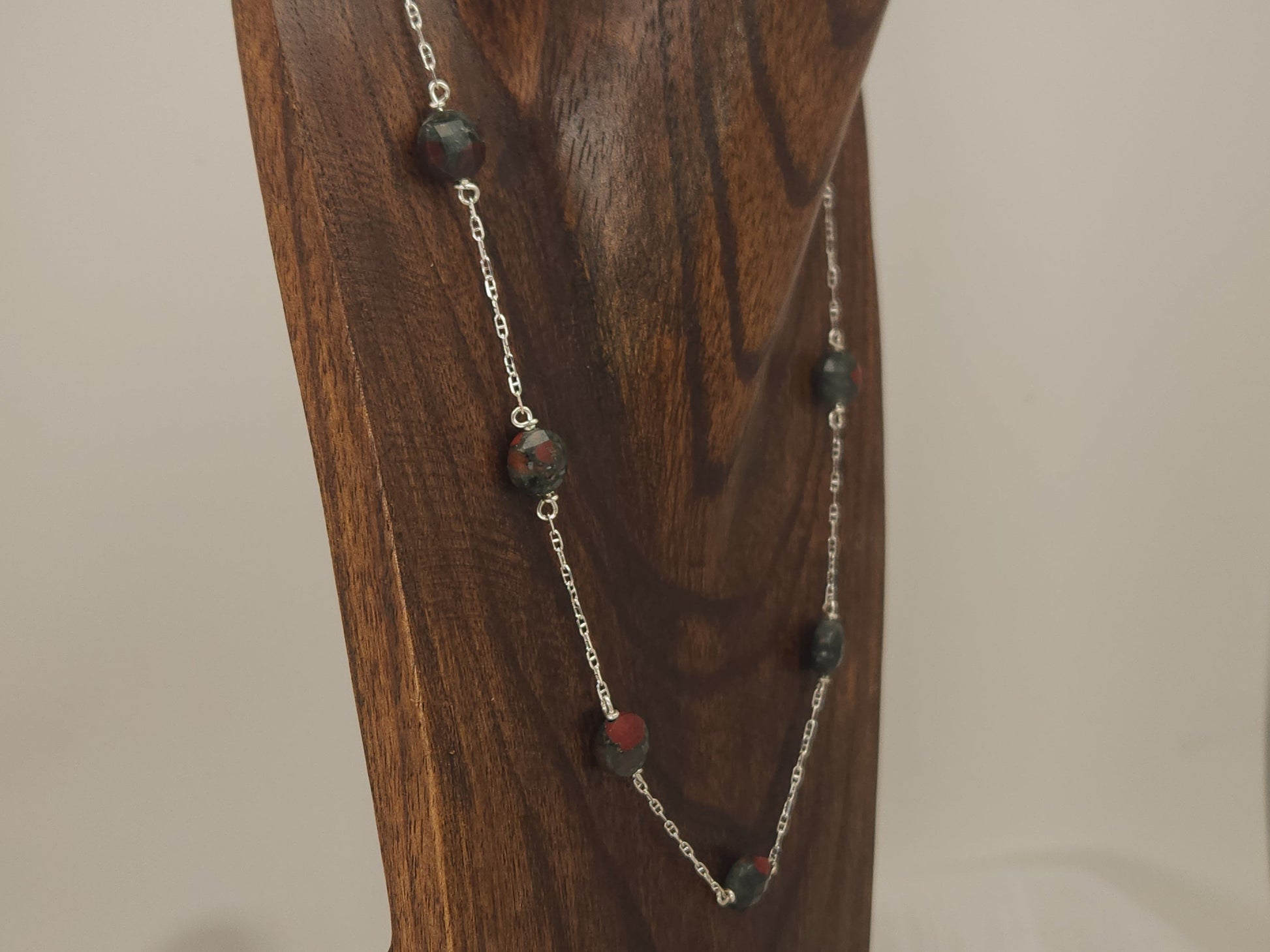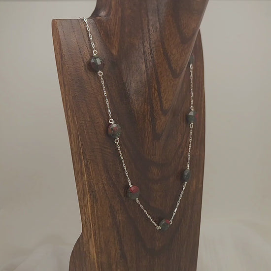 This eye-catching necklace features 9 beads of faceted Dragon Blood Jasper suspended on an 18" Sterling Silver anchor chain. Dragon Blood is an unusual variety of Jasper with splashes of bold red across fields of mottled deep green, brown and grey. The stones are a unique rounded-coin shape with checkered facets that catch the light from many different angles, giving the dark stones a glitter where other beads would appear dull. It is clasped with a sterling silver spring ring.