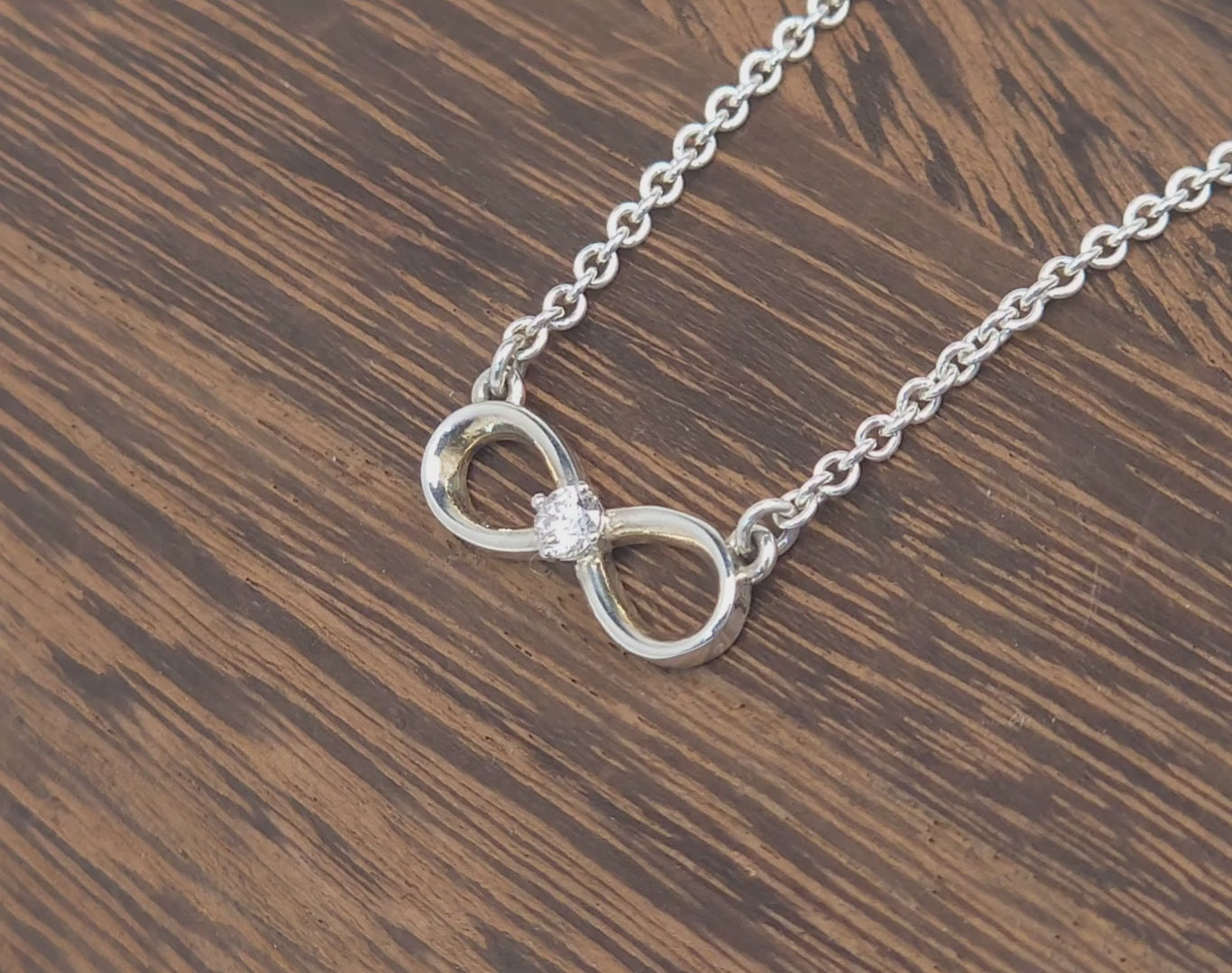 This dainty solid sterling silver pendant in the shape of an infinity symbol features a eye-catching diamond set in the center. The diamond is a G-H color, SI2 clarity stone measuring 3mm. The pendant is attached to an 18" sterling silver link chain fastened with a lobster clasp.