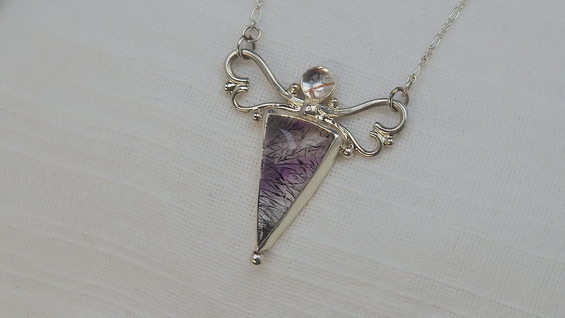 This stunning Lepidocrocite Quartz (also known as Strawberry Quartz) features soft red hues and a distinctive needling. It is set in a hand-fabricated fine silver and sterling silver mounting and is accented by a rutilated quartz cabochon. It comes attached to an 18" sterling silver oval link chain with a lobster clasp.