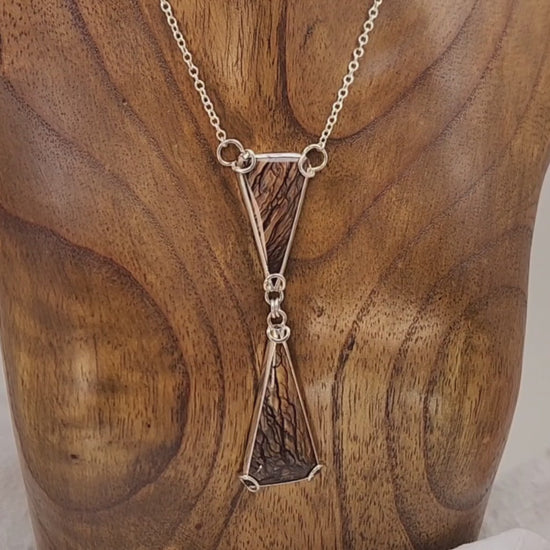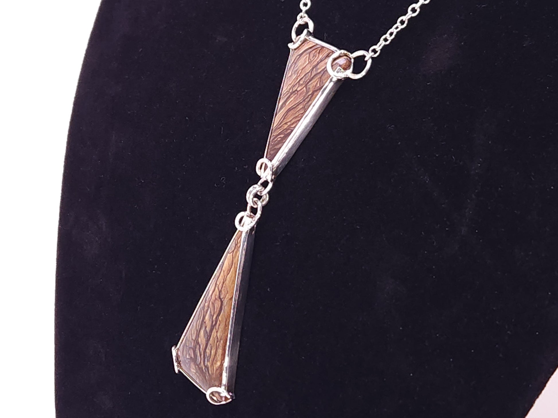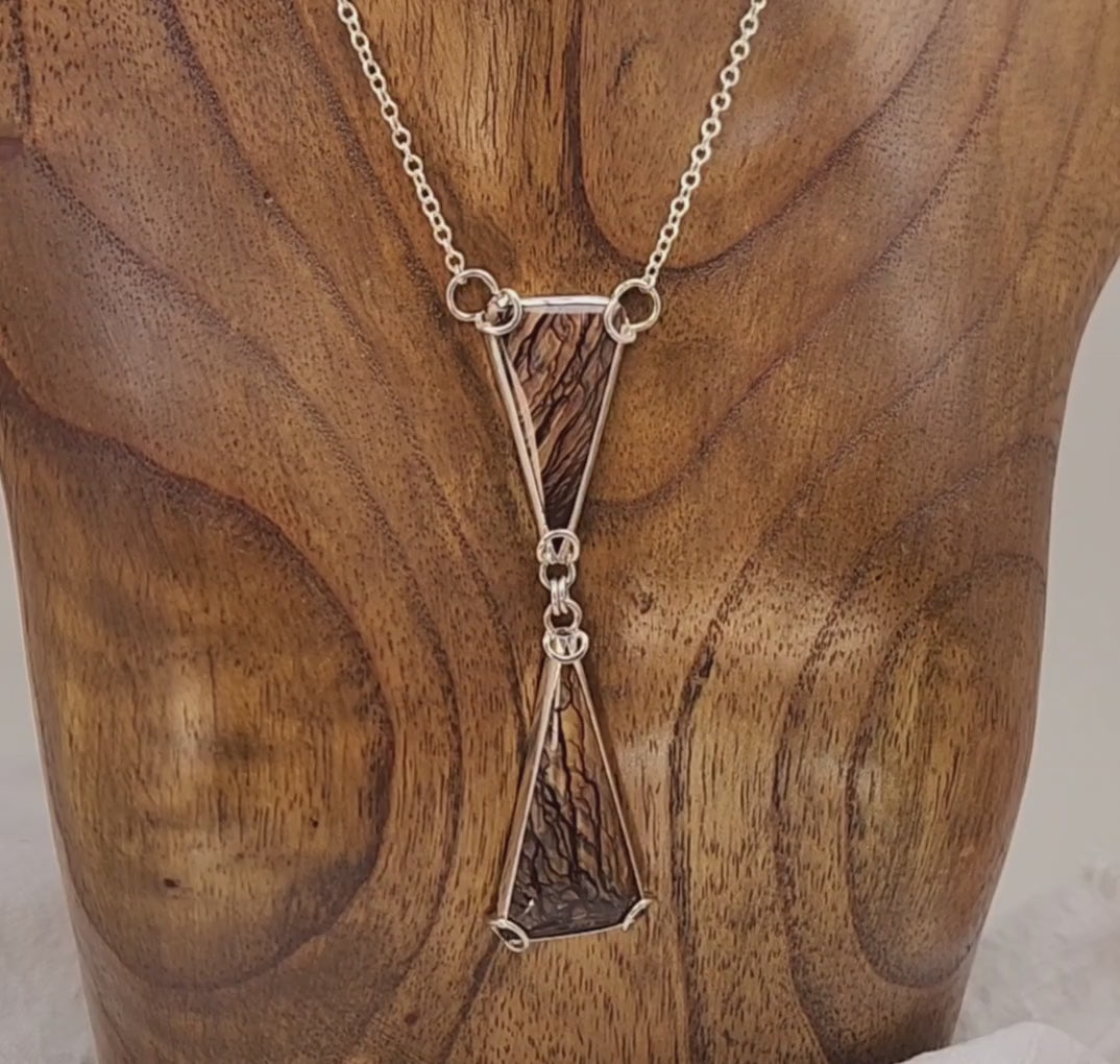 This huge, bold statement piece features two matched Picture Jasper triangular cabochons with crackling traces of black and brown arcing through a field of gold and tan. The stones are set in hand fabricated fine silver bezels with sterling silver ring prongs as accents. It is attached to an 18" sterling silver link chain clasped with a spring ring.