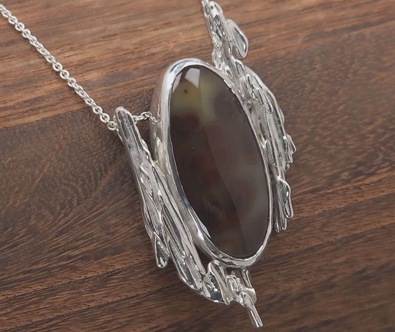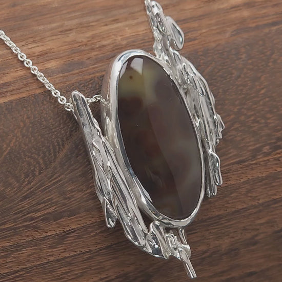 This unusual coffee and cream colored Montana Agate features echoing concentric circles of dark brown fading deeper into the stone to softer brown tones. The stone is set in a fine silver bezel and accented by cascading broomcast sections, created by pouring molten sterling silver through broom straw. The pendant weights 26 grams due to the significant amount of silver in the solid broomcast sections. It is attached to an 18" sterling silver link chain clasped with a spring ring.