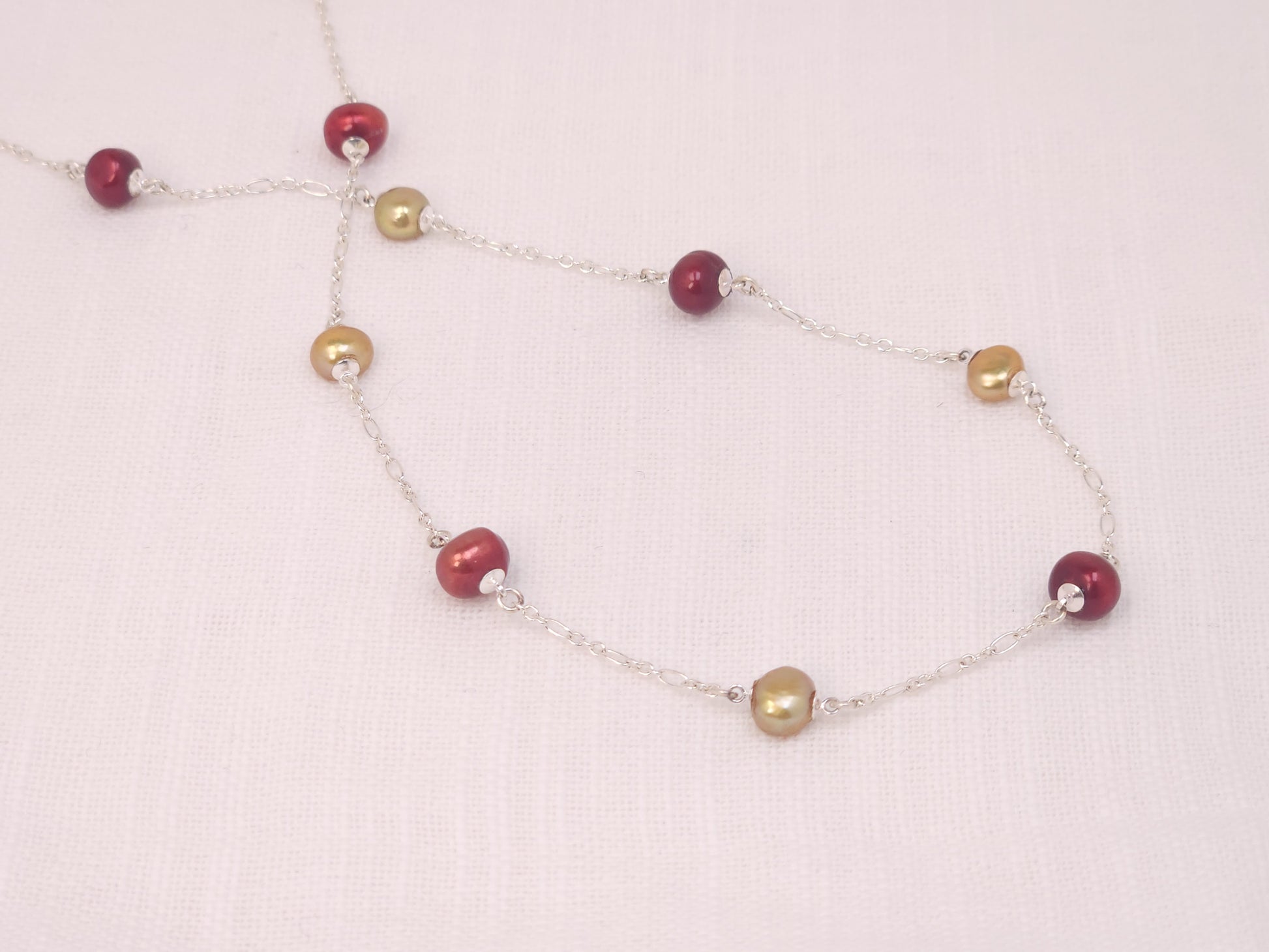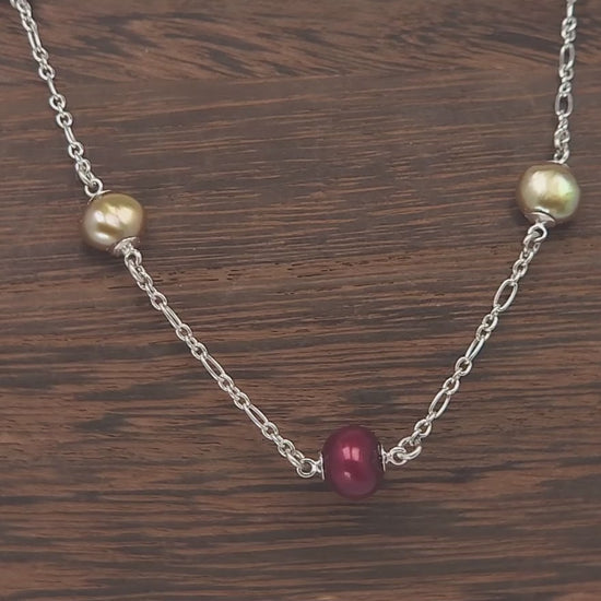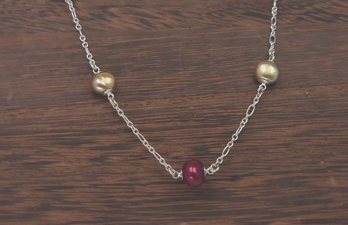 This distinctive station necklace features alternating freshwater pearls in scarlet red and gold. They are finished with sterling silver pearl cups and spaced evenly on a sterling silver 18" oval link chain clasped with a lobster clasp.