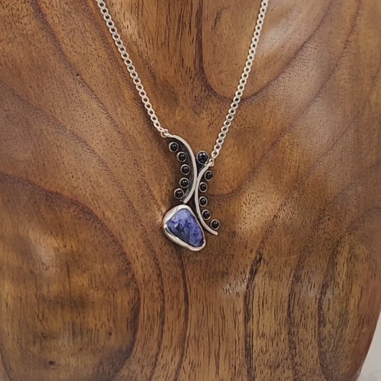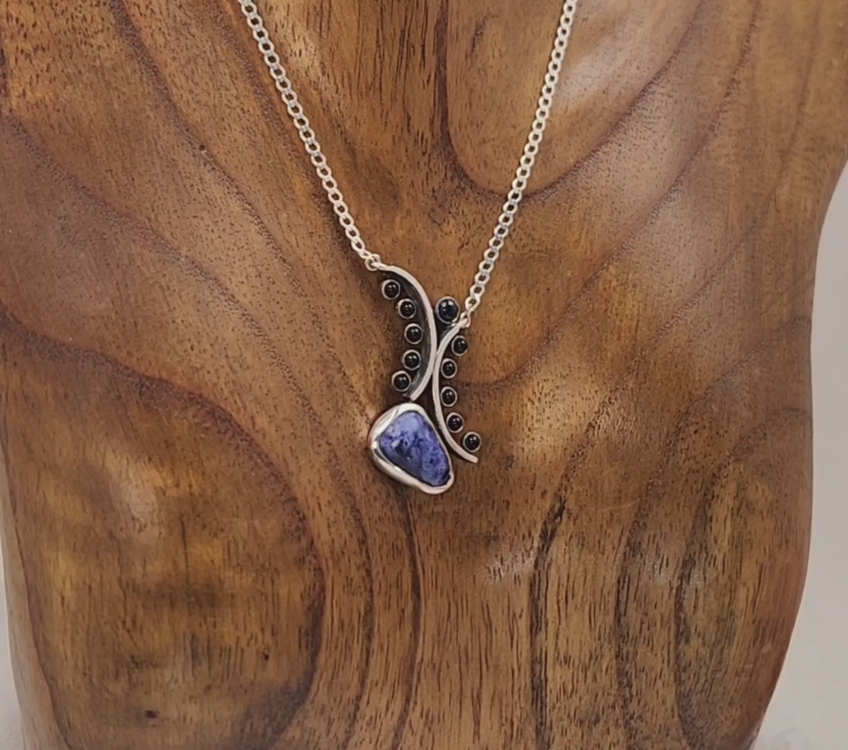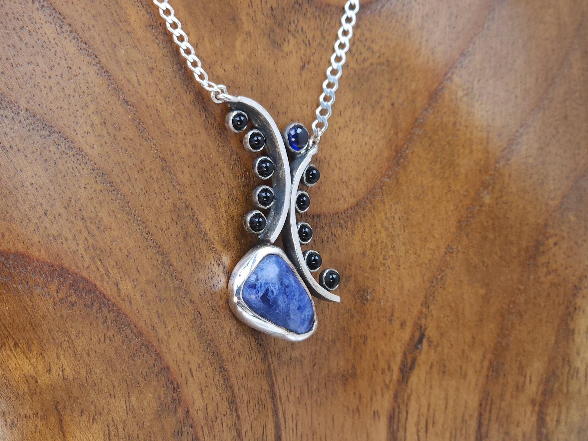 This one-of-a-kind pendant features a distinctive bright blue Sodalite, accented with 10 Onyx cabochons and a bold blue lab-grown sapphire in an extraordinary hand crafted mounting of fine silver and sterling silver. The stones are set in fine silver bezels mounted between two solid sterling silver curls. The pendant is attached to a polished 18" solid sterling silver curb chain clasped with a spring ring.