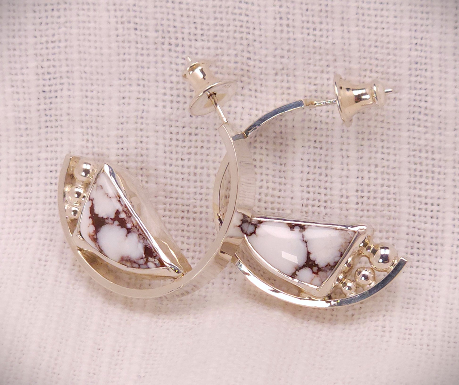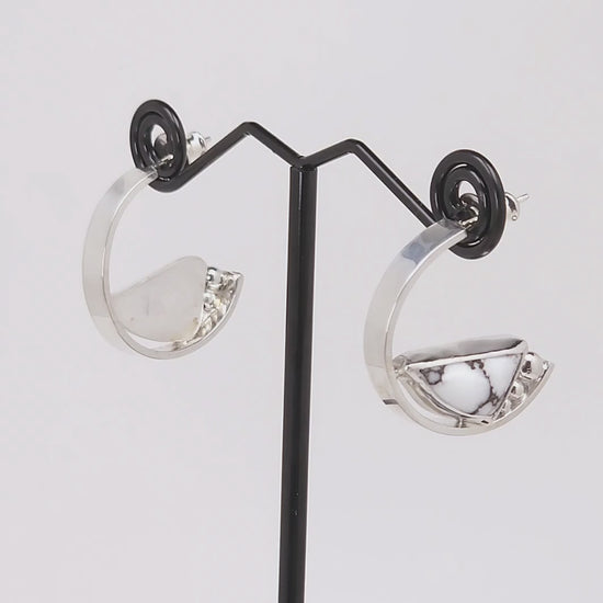 These solid sterling silver flat hoops feature two matched Wild Horse Magnesite cabochons with deep red crackling inclusions on a field of pure white, set in fine silver bezels with sterling silver ball accents. The hoops are mounted with sterling silver earring posts clasped with sterling silver bullet backs.